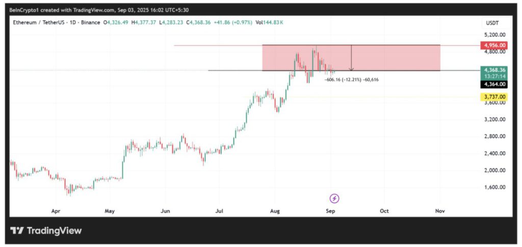 Meskipun adanya aliran positif ini, ETH sempat diperdagangkan pada harga $4.368 per 3 September. Harga ini turun lebih dari 12% dari puncak tertinggi sepanjang masa yang tercatat pada 24 Agustus, dengan para analis mengatakan bahwa penjualan ritel menekan momentum harga.
