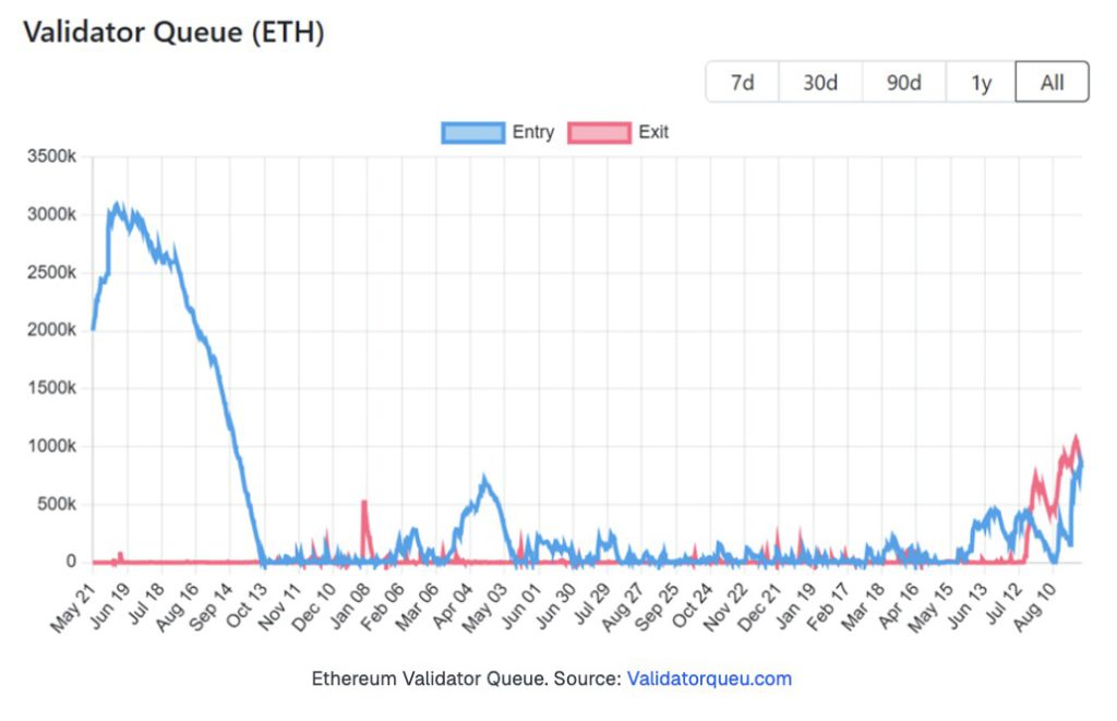 Hal ini telah membantu mendorong antrean validator ke level tertinggi. Pada saat yang sama, hal ini juga mengurangi risiko eksodus massal, karena antrean keluar telah menurun sebesar 20% sejak bulan Agustus.