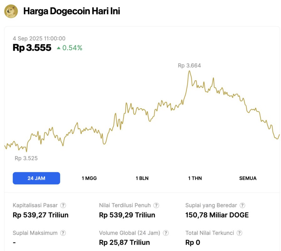 Pada 4 September 2025, harga Dogecoin tercatat mengalami kenaikan tipis 0,54% dalam waktu 24 jam, diperdagangkan pada harga $0.2166 atau setara dengan Rp3.555. Dalam periode 24 jam terakhir, harga DOGE bergerak dalam kisaran Rp3.525 hingga Rp3.664.