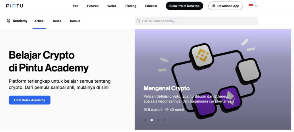 Materi pembelajaran disusun secara bertahap melalui kelas academy, mulai dari tingkat pemula, menengah, hingga lanjutan, sehingga dapat disesuaikan dengan kebutuhan setiap pembelajar. Selain itu, tersedia pula kamus crypto yang berisi penjelasan istilah-istilah penting untuk membantu memahami berbagai istilah yang umum digunakan di ekosistem aset digital.