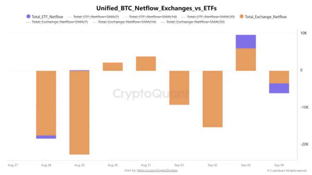 Sementara itu, data ETF menceritakan kisah yang berbeda. Aliran masuk yang tajam pada 3 September segera diimbangi dengan arus keluar keesokan harinya, sehingga permintaan bersih ETF tetap datar.