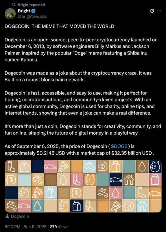 Pada akhir minggu kemarin, Dogecoin sempat diperdagangkan sekitar $0,2145 dengan kapitalisasi pasar sebesar $32,35 miliar. Di tengah sentimen bullish yang mulai muncul, pengajuan ETF baru juga menempatkan koin ini kembali menjadi sorotan.
