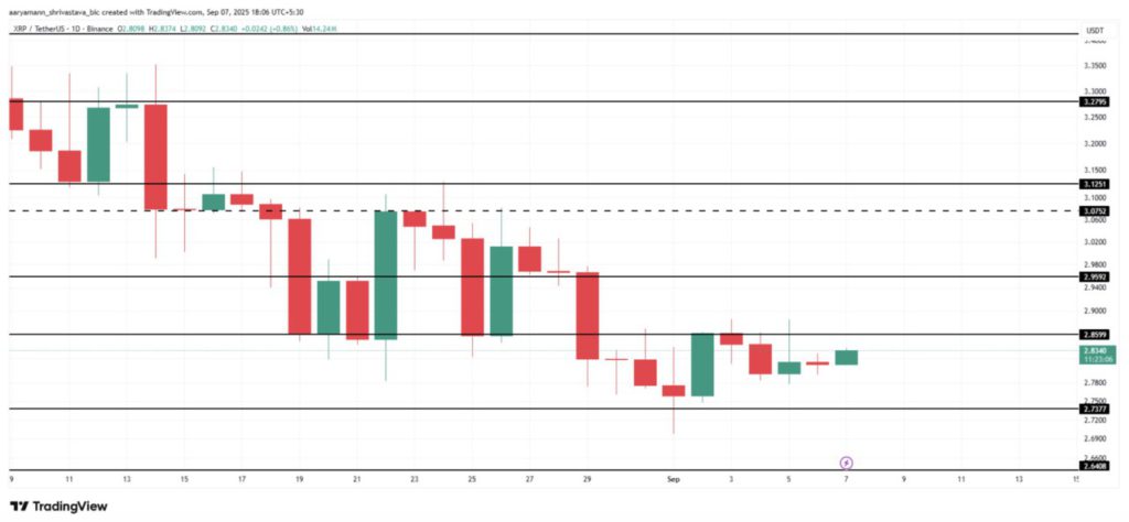 Pada 7 September, XRP sempat diperdagangkan di level $2,83, hanya sedikit di bawah resistensi kunci di $2,85. Lonjakan akumulasi yang terjadi belakangan ini memberikan dorongan kuat bagi XRP untuk mencoba breakout dari zona konsolidasi.
