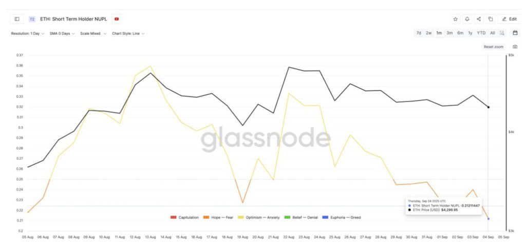 Selain akumulasi whale, data on-chain menunjukkan investor jangka pendek atau āweak handsā mulai keluar dari pasar. Hal ini terlihat dari indikator Net Unrealized Profit/Loss (NUPL) untuk holder jangka pendek yang turun ke level 0,21, terendah kedua dalam sebulan terakhir. Level ini biasanya menandakan titik lokal rendah yang berpotensi menjadi awal rebound harga.