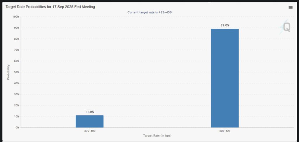 Data dari CME FedWatch menunjukkan adanya peluang 11% bahwa Fed akan menurunkan suku bunga sebesar 50 bps pada pertemuan FOMC mendatang. Hal ini terjadi menjelang rilis data inflasi PPI dan CPI oleh Departemen Tenaga Kerja pada tanggal 10 dan 11 September.
