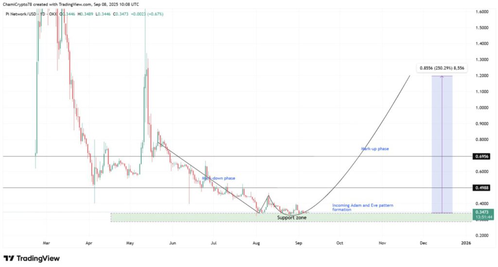 Harga Pi Coin terus bergerak konsolidasi di area support, di mana para pembeli masih bertahan dan mencegah penurunan lebih dalam. Zona ini telah menjadi lantai kuat yang menahan harga meski sebelumnya sempat mendapat tekanan jual berbulan-bulan. Per 8 September, nilai pasar Pi Coin berada di sekitar $0,34.
