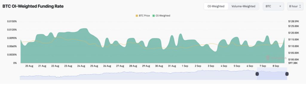 Selain lonjakan akumulasi jangka panjang, tingkat pendanaan (funding rate) BTC di bursa utama juga tetap positif, meskipun performa harga belakangan ini kurang menggairahkan. Berdasarkan data Coinglass, saat ini funding rate tercatat di 0,0091%.