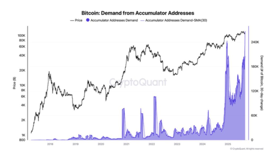 Menurut laporan terbaru dari analis pseudonim CryptoQuant, Darkfost, permintaan dari alamat-akumulator BTC saat ini “melonjak tajam.”