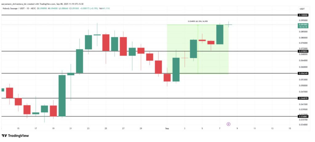 Di antara yang paling menonjol dari altcoin adalah meme coin, dengan Nobody Sausage (NOBODY) yang melesat hingga 62% dalam tujuh hari terakhir. Lebih lanjut, laman BeInCrypto turut menyoroti pergerakan NOBODY dan dua meme coin lainnya yang jadi perhatian menjelang akhir kuartal ketiga tahun ini.