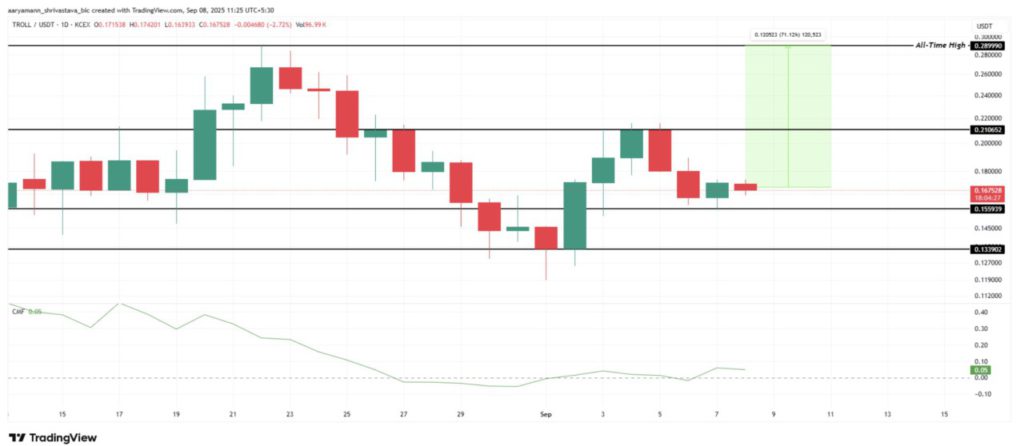 Saat ini, TROLL masih bertahan di atas harga $0,155, dengan resistensi terdekat di $0,210. Arus masuk dana yang meningkat—tercermin dari indikator CMF—mengisyaratkan adanya potensi kenaikan.