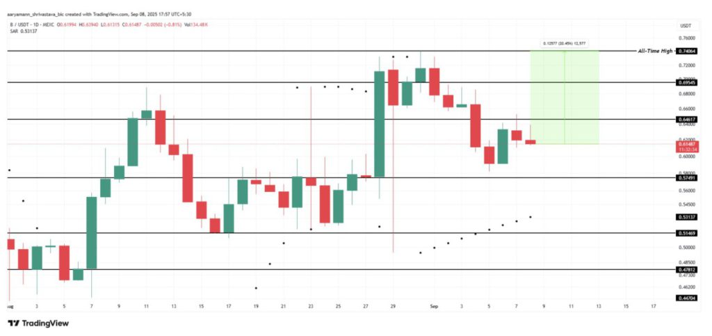 Harga BUILDon (B) saat ini berada di kisaran $0,614, bergerak stabil setelah menunjukkan ketahanan dalam beberapa hari terakhir. Altcoin ini masih sekitar 20% lagi untuk kembali menyentuh harga tertinggi sepanjang masa (All-Time High) di $0,740, level kunci yang dapat menentukan pergerakan besar selanjutnya.