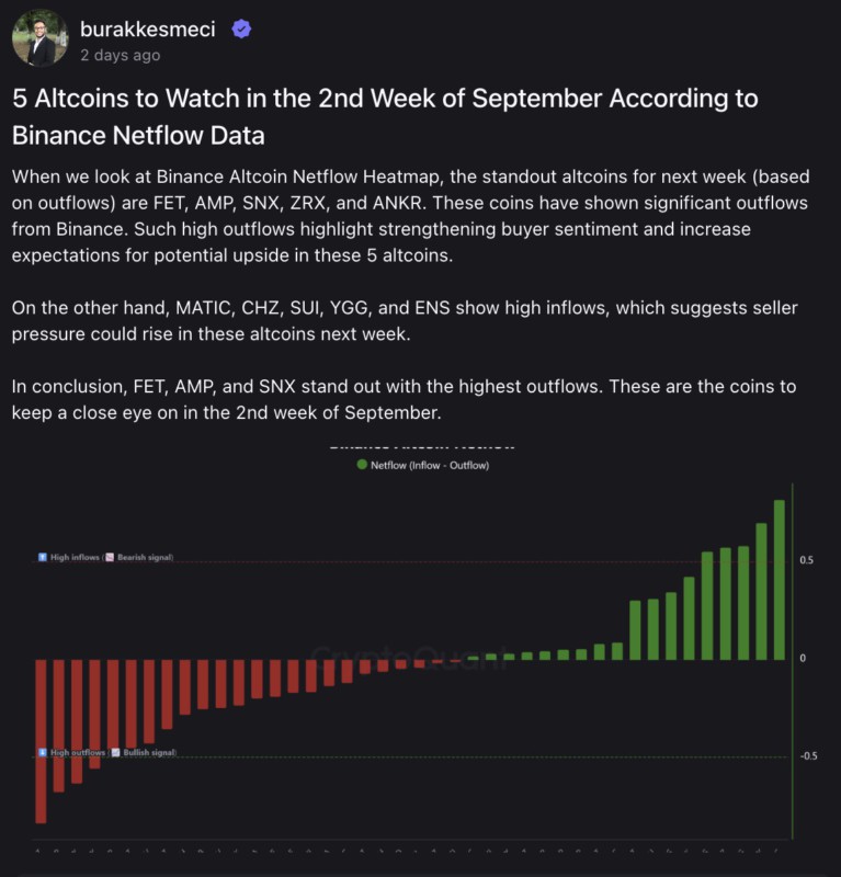 Menurut laporan yang dibagikan oleh CryptoQuant, Altcoin Netflow Heatmap terbaru milik Binance menunjukkan bahwa Fetch.ai (FET), Amp (AMP), Synthetix (SNX), 0x (ZRX), dan Ankr (ANKR) mencatat arus keluar signifikan dari bursa kripto. Fenomena ini sering dianggap sebagai tanda meningkatnya kepercayaan investor dan potensi momentum bullish.