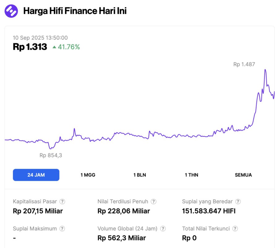 Di posisi selanjutnya, harga Hifi Finance tercatat di level Rp1.313, mengalami kenaikan signifikan sebesar 41,76% dalam 24 jam terakhir. Sepanjang periode ini, HIFI bergerak dari level terendah Rp854,3 hingga sempat mencapai harga tertinggi di Rp1.487 sebelum sedikit terkoreksi.