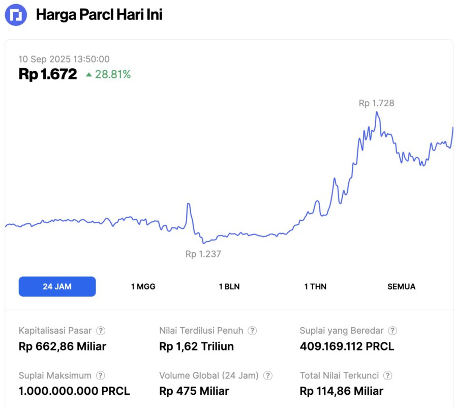 Pada 10 September, harga Parcl tercatat di level Rp1.672, naik sebesar 28,81% dalam 24 jam terakhir. Dalam periode ini, PRCL bergerak dari level terendah Rp1.237 hingga menyentuh harga tertinggi harian di Rp1.728, menunjukkan tren kenaikan yang cukup konsisten.