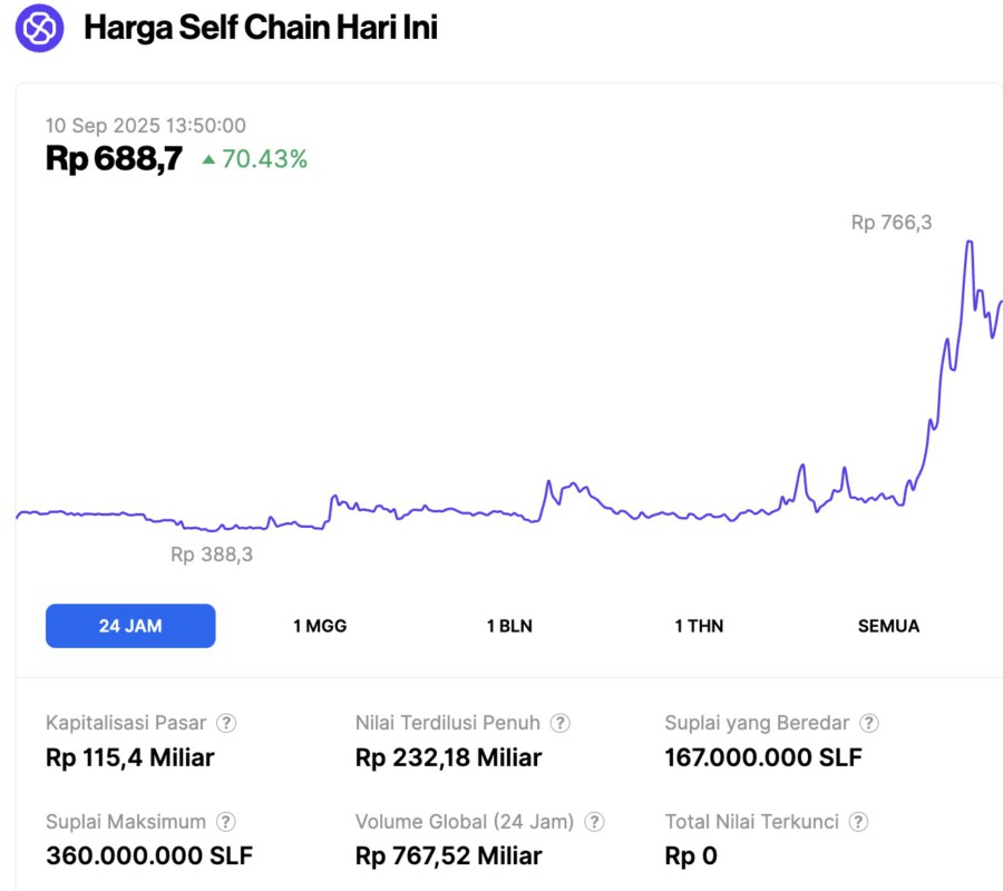 Menduduki posisi pertama dalam kategori crypto yang menggairahkan hari ini di Pintu Market, pada 10 September 2025, harga Self Chain tercatat di level Rp688,7, melonjak tajam sebesar 70,43% hanya dalam sehari.