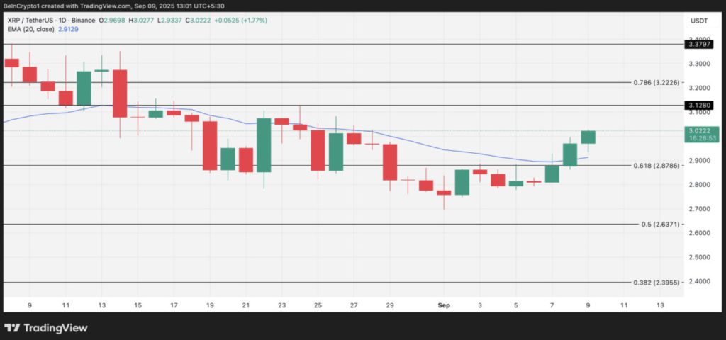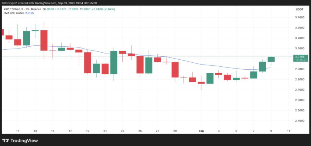 Selain itu, reli XRP juga telah mendorong harganya menembus Exponential Moving Average (EMA) 20-hari pada grafik harian, yang semakin mengonfirmasi prospek bullish. Pada saat penulisan, EMA 20 berada di sekitar $2,91, berfungsi sebagai support dinamis di bawah harga XRP.