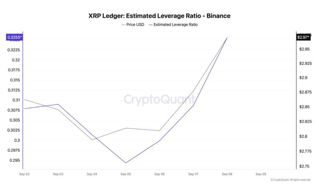 Menurut data dari CryptoQuant, Estimated Leverage Ratio (ELR) XRP di Binance naik ke level tertinggi mingguan di angka 0,325, atau meningkat sekitar 6% dalam tujuh hari terakhir. Kenaikan ini menandakan tumbuhnya kepercayaan investor sekaligus meningkatnya selera risiko di pasar.
