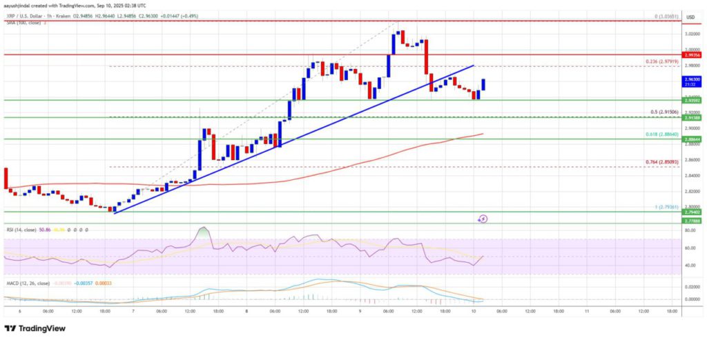 Koreksi ini melihat harga turun di bawah level retracement Fibonacci 23,6% dari kenaikan terakhir yang dimulai dari titik rendah $2,794 hingga titik tinggi $3,036. Selain itu, terjadi pula pemecahan pada garis tren bullish yang memiliki dukungan di $2,9650 pada grafik per jam pasangan XRP/USD. Meskipun ada penurunan, harga masih bertahan di atas $2,920 dan rata-rata pergerakan sederhana 100 jam.
