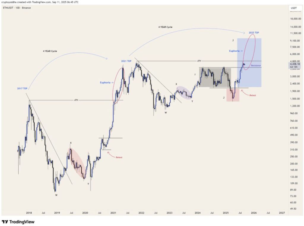Pergerakan ini mencerminkan pola siklikal yang mirip dengan tahun 2017 dan 2021, ketika reli euforia terjadi setelah periode reset yang panjang. Oleh karena itu, jalur saat ini menunjukkan bahwa Ethereum mungkin sedang memasuki fase pertumbuhan vertikal yang serupa.