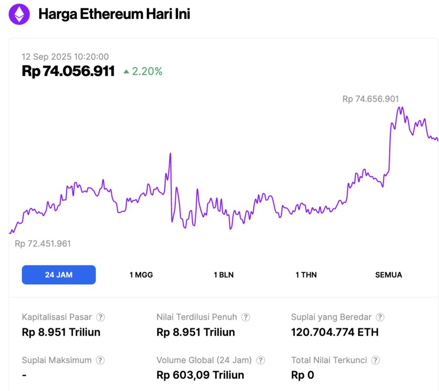 Pada 12 September 2025, harga Ethereum tercatat berada di sekitar $4,501 atau setara dengan Rp74.056.911, mengalami kenaikan 2,20% dalam 24 jam terakhir. Sepanjang periode ini, ETH sempat menyentuh level terendahnya di Rp72.470.949, dan level tertingginya di Rp74.656.901.