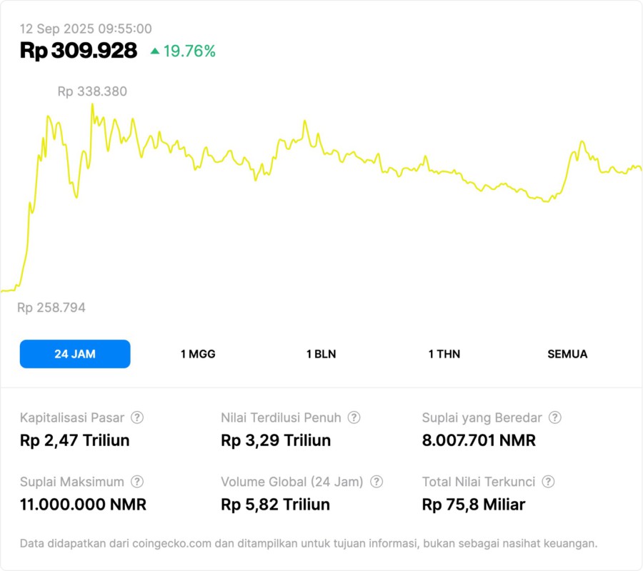 Harga tertinggi harian NMR sempat menyentuh Rp338.380, sementara titik terendahnya berada di kisaran Rp258.794. Ini menunjukkan volatilitas yang cukup tinggi, sejalan dengan sentimen pasar crypto global.