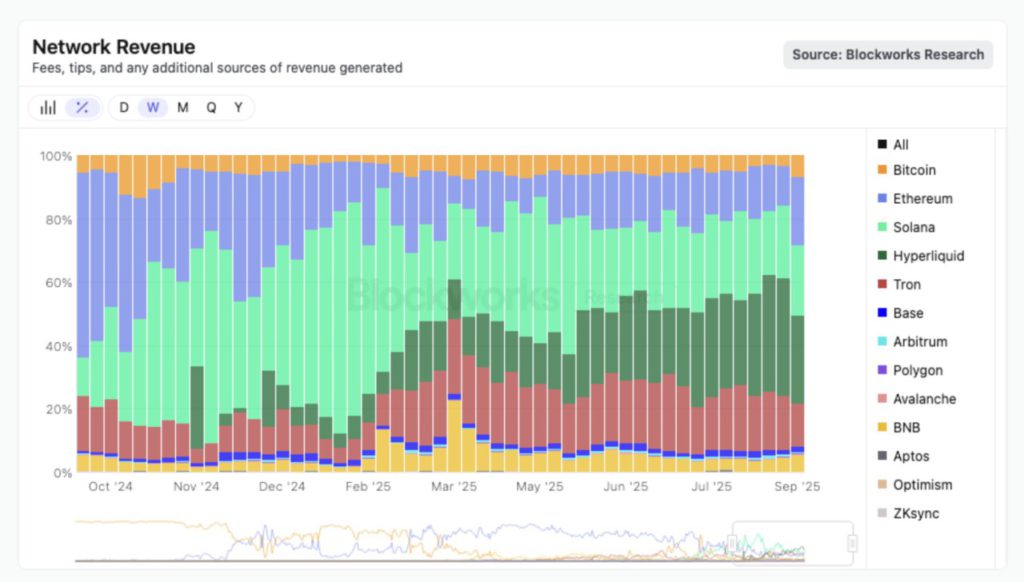 Hyperliquid telah berhasil mengeksekusi perdagangan senilai miliaran dolar dengan sangat cepat dan minim gangguan, sehingga berhasil menarik kepercayaan investor. Berdasarkan data dari Blockworks Research, Hyperliquid memimpin dalam hal pendapatan jaringan di antara semua blockchain selama hampir empat minggu berturut-turut.