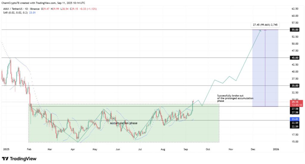 Harga AVAX secara resmi telah menembus fase akumulasi yang berlangsung lama, mengonfirmasi perubahan struktur pasar yang signifikan. Saat ini, AVAX diperdagangkan di harga $29,15, sedikit di atas batas atas rentang sebelumnya di $27,58, yang kini berfungsi sebagai level support langsung.