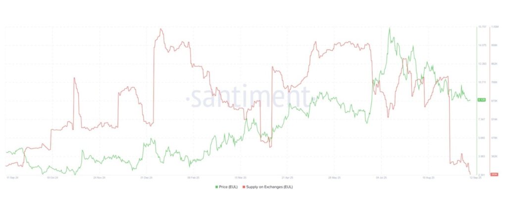 Data dari Santiment menunjukkan bahwa listing pada 5 September memicu penurunan tajam pada cadangan EUL di bursa, yang kini berada di titik terendah dalam satu tahun terakhir.