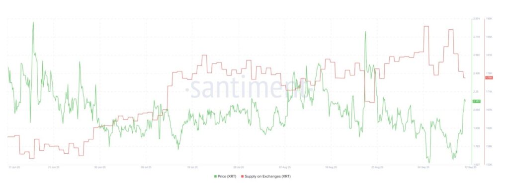 Namun, data dari Santiment memberikan sinyal positif. Harga token XRT relatif stabil di sekitar $2 sejak awal tahun, meskipun cadangan di bursa sempat meningkat.