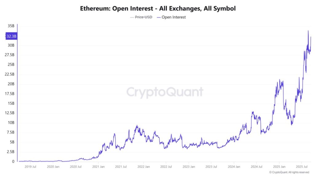 Open Interest (OI) Ethereum telah meningkat menjadi $32,27 miliar, naik 4,11% dalam 24 jam terakhir (14/9/25). Kenaikan yang konsisten ini mencerminkan semakin aktifnya posisi spekulatif, di mana para trader meningkatkan eksposur baik untuk posisi long maupun short.