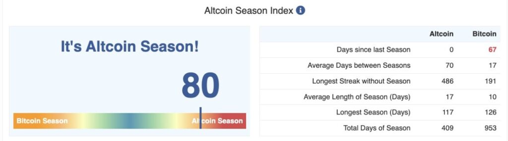 Jakarta, Pintu NewsĀ ā Altcoin Season Index yang dirilis oleh Blockchain Center baru-baru ini mencapai angka 80, menandakan dominasi pasar oleh altcoin. Ketika indeks ini melewati ambang 75, ini menunjukkan bahwa mayoritas altcoin mengungguli Bitcoin , menarik perhatian investor untuk beralih dari Bitcoin.