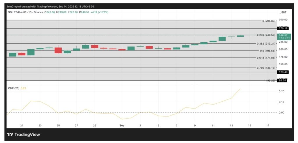 Harga SOL naik 22% dalam sepekan terakhir dan saat ini diperdagangkan di level $246,91. Indikator Chaikin Money Flow (CMF) menunjukkan tren naik, mengindikasikan kuatnya permintaan yang mendorong reli ini. Saat ini, indikator momentum tersebut berada di level 0,23.