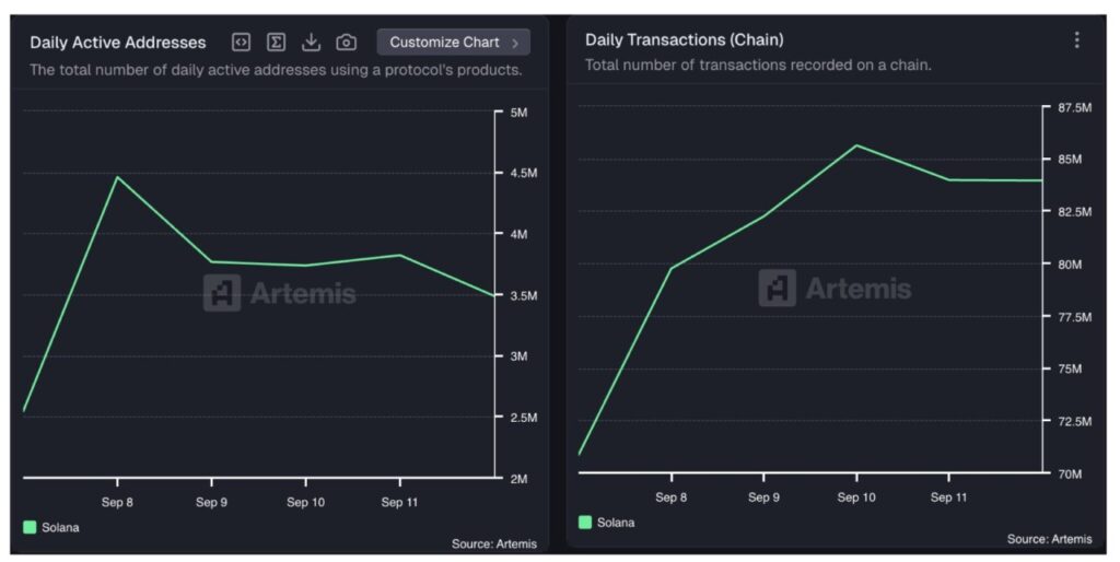 Data dari Artemis memperkuat tren ini, menunjukkan bahwa Solana mengalami peningkatan jumlah alamat aktif harian dan transaksi. Menurut penyedia data on-chain tersebut, dalam sepekan terakhir, jumlah alamat aktif harian yang melakukan setidaknya satu transaksi SOL meningkat sebesar 37%.