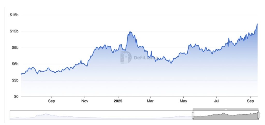 Berdasarkan data dari DeFiLlama, total nilai terkunci [TVL] di sektor DeFi Solana saat ini mencapai rekor tertinggi sebesar $13,38 miliar, melonjak 18% hanya dalam sepekan terakhir.