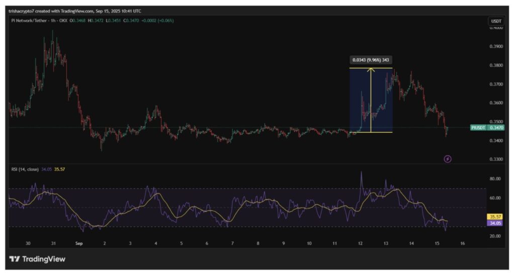 Per 15 September, PI sempat diperdagangkan sedikit di atas level support sebelumnya, yaitu sekitar $0,348. Jika level ini tidak mampu dipertahankan, harga Pi Coin berpotensi turun kembali ke zona $0,340 – $0,335, di mana sebelumnya pembeli sempat menunjukkan perlawanan.