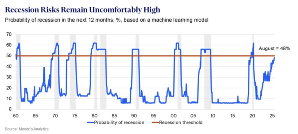 Meskipun ada kekhawatiran tentang resesi di Amerika Serikat, beberapa ekonom seperti Mark Zandi dari Moody’s Analytics memperkirakan ada kemungkinan 48% AS akan mengalami resesi dalam 12 bulan ke depan. Namun, data pertumbuhan yang tangguh menunjukkan ketahanan ekonomi yang tidak terduga.