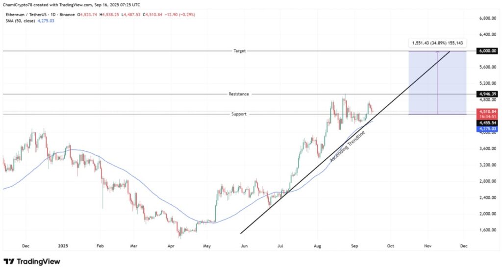 Per 16 September, harga ETH sempat berada di level $4.511, bertahan kokoh di atas EMA 50 hari yang berada di sekitar $4.275. Karena EMA 50 terletak di bawah harga saat ini, setup teknikal ini mengindikasikan kemungkinan uji ulang support di $4.455 sebelum dorongan naik berikutnya terjadi.