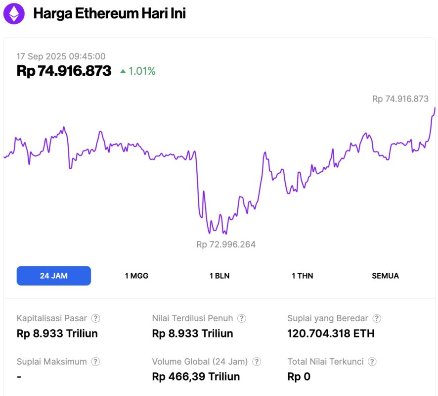 Pada 17 September 2025, harga Ethereum tercatat berada di sekitar $4,549 atau setara dengan Rp74.916.873, mengalami kenaikan 1,01% dalam 24 jam terakhir. Sepanjang periode ini, ETH sempat menyentuh level terendahnya di RpĀ 72.996.264, dan level tertingginya di Rp74.936.393.