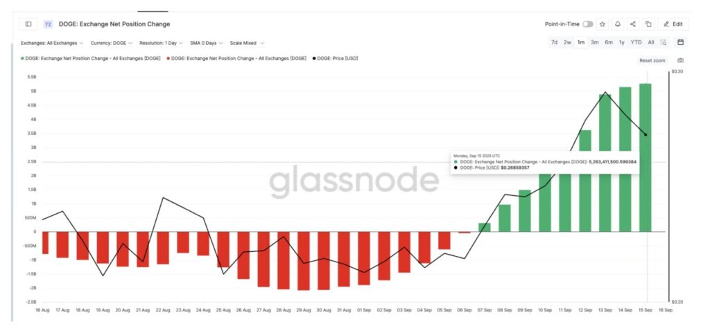 Angka positif ini berarti lebih banyak DOGE yang disetor ke bursa dibandingkan yang ditarik, yang mengindikasikan meningkatnya tekanan jual. Antara 7 hingga 15 September, saldo DOGE di bursa meningkat sebanyak 4,96 miliar DOGE (hampir $1,29 miliar), menjadi arus masuk terbesar dalam satu bulan terakhir.