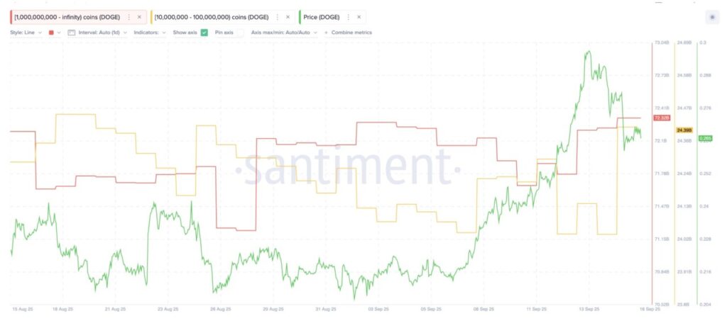 Pada saat yang sama, para whale juga mulai bergerak aktif. Pemilik lebih dari 1 miliar DOGE menambahkan 540 juta token (senilai $140 juta) antara 13 hingga 15 September.