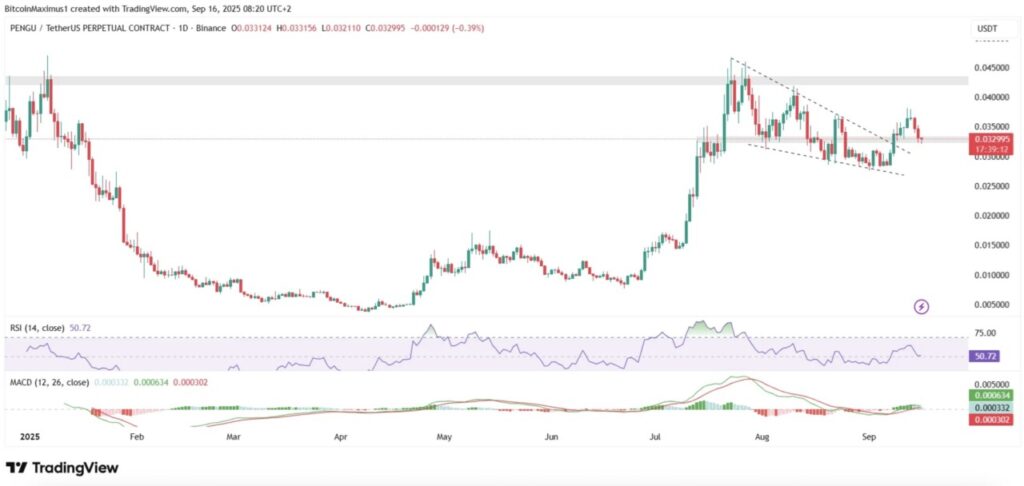 PENGU sempat menyentuh titik terendah di $0,027 pada 1 September, sebelum akhirnya memantul kembali dan berhasil menembus pola wedge menurun (descending wedge) pada 8 September.
