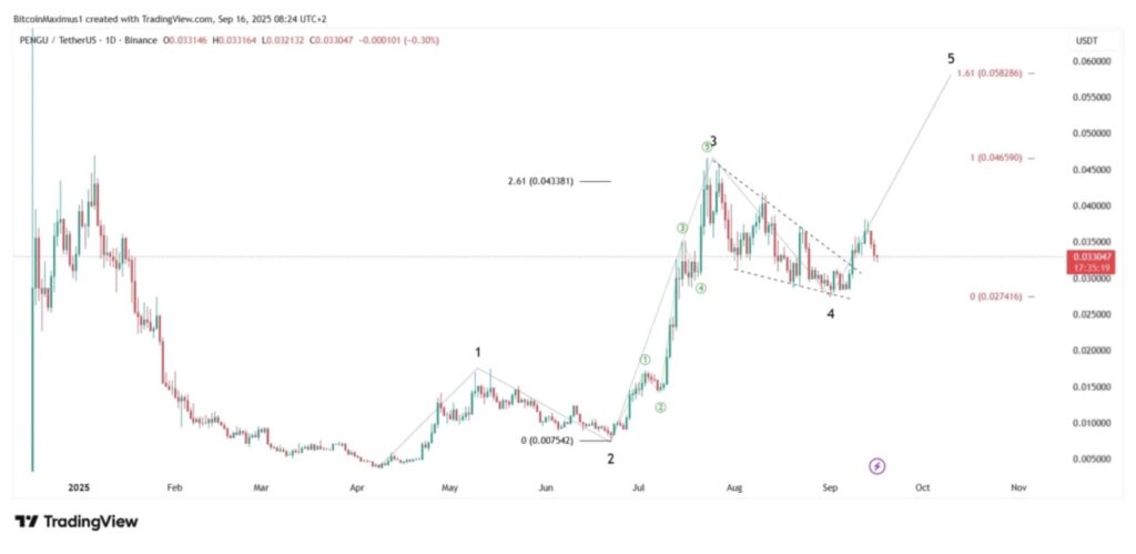 Sejalan dengan pergerakan harganya, analisis gelombang (wave count) juga menunjukkan bahwa PENGU berpotensi mencetak rekor tertinggi baru dalam waktu dekat.