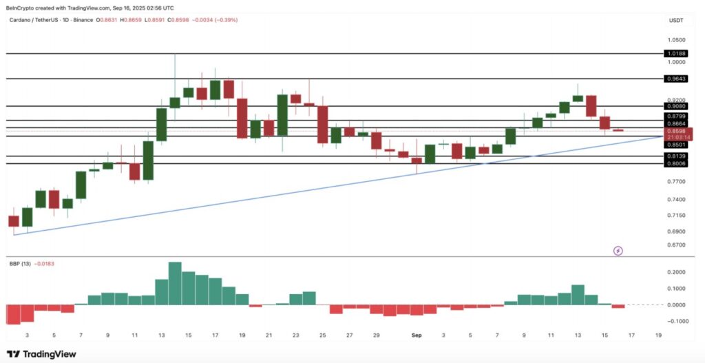 Dalam grafik harga Cardano, terlihat bahwa ADA sedang bergerak dalam pola segitiga naik (ascending triangle) dengan level support di sekitar $0,85.