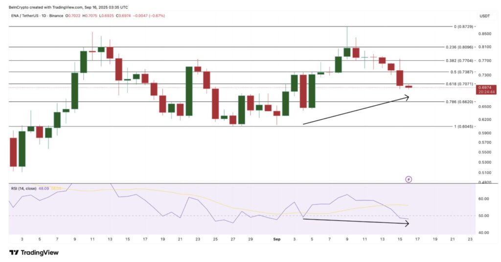 Dari sisi teknikal, harga ENA telah mengalami koreksi tajam—turun sekitar 12% dalam sepekan terakhir dan hampir 10% dalam 24 jam terakhir. Meski demikian, token ini menunjukkan divergensi bullish tersembunyi pada indikator RSI (Relative Strength Index), yang mengukur momentum berdasarkan perbandingan antara kenaikan dan penurunan harga terbaru.