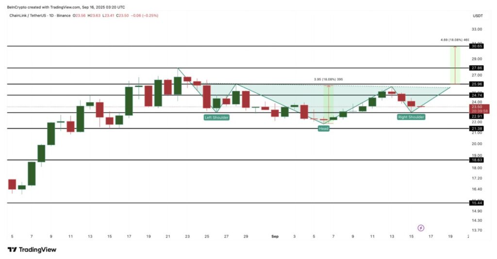 Secara teknikal, grafik harga Chainlink saat ini membentuk pola inverse head-and-shoulders, sebuah formasi klasik yang biasanya menandakan pembalikan arah ke atas. Untuk mengonfirmasi pola ini, LINK harus menembus neckline di sekitar $25,96.