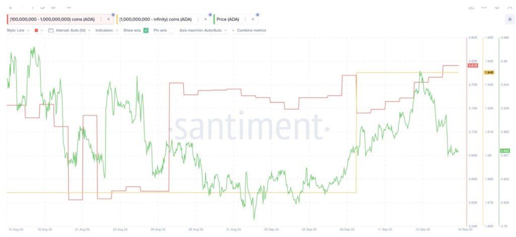 Para investor besar (crypto whales) terus menambah kepemilikan mereka atas Cardano sepanjang bulan September. Data on-chain menunjukkan bahwa sejak 9 September, pemegang dengan lebih dari 1 miliar ADA telah meningkatkan jumlah aset mereka dari 1,88 miliar menjadi 1,94 miliar token.