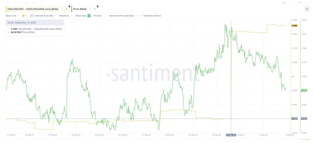 Kelompok pemegang ENA dalam kisaran 100 juta hingga 1 miliar token tercatat memiliki sekitar 4,46 miliar token pada 10 September, saat harga ENA berada di kisaran $0,81. Sejak saat itu, jumlah tersebut meningkat menjadi 5,66 miliar token—meskipun harga turun menjadi $0,69. Ini berarti para whale menambahkan sekitar 1,2 miliar token, senilai kurang lebih $828 juta pada harga saat ini.