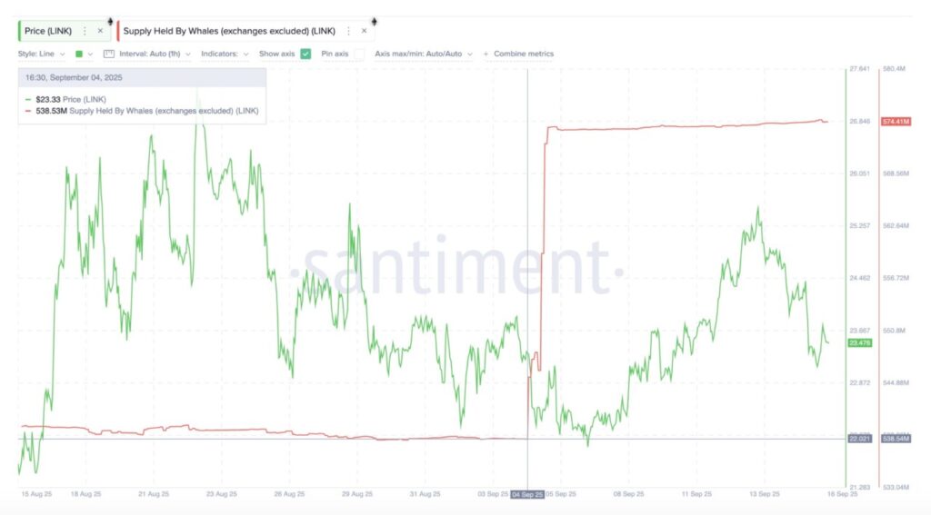 Aksi beli ini dimulai ketika harga LINK turun di bawah $22 dan terus berlanjut meskipun harga mulai naik. Para whale tidak tergoda untuk menjual saat harga memantul atau panik karena penurunan jangka pendek.