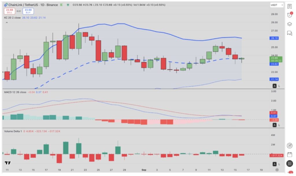 Secara teknikal, kondisi harga Chainlink masih menunjukkan tren positif, namun menghadapi tantangan besar di level resistensi $25. Per 16 September, harga LINK diperdagangkan di sekitar $23,7, tetap bertahan di atas garis tengah Keltner Channel di $23,6.