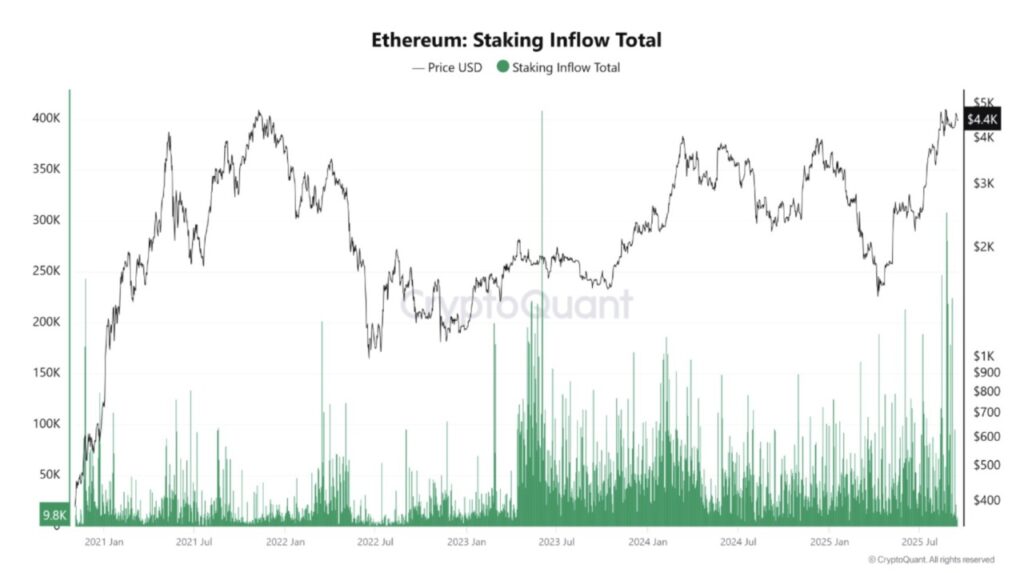 Data dari CryptoQuant menunjukkan bahwa aliran staking Ethereum (ETH) melonjak ke level tertinggi sejak pertengahan 2023. Dalam periode 14 Agustus hingga 4 September, inflow ETH terus meningkat, dengan puncaknya mencapai 308.000 ETH pada 25 Agustus.